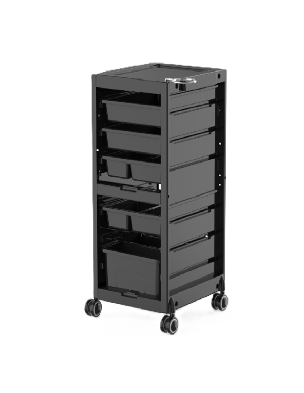 Carro auxiliar de alta gama, fabricado en plástico técnico de gran durabilidad. Incorpora 6 bandejas extraíbles, soportes térmicos para herramientas calientes, soporte universal para secador, toallero, cerradura con llave y ruedas silenciosas de 360º.