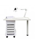 Mesa manicura compuesta de tablero en madera blanco, pie de aluminio y mueble termoconformado con ruedas.