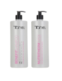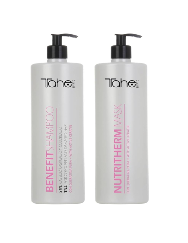 Pack de dos productos de 1 litro, champú para cabellos teñidos y castigados y Mascarilla con Queratina pura y Células madre vegetales activas.