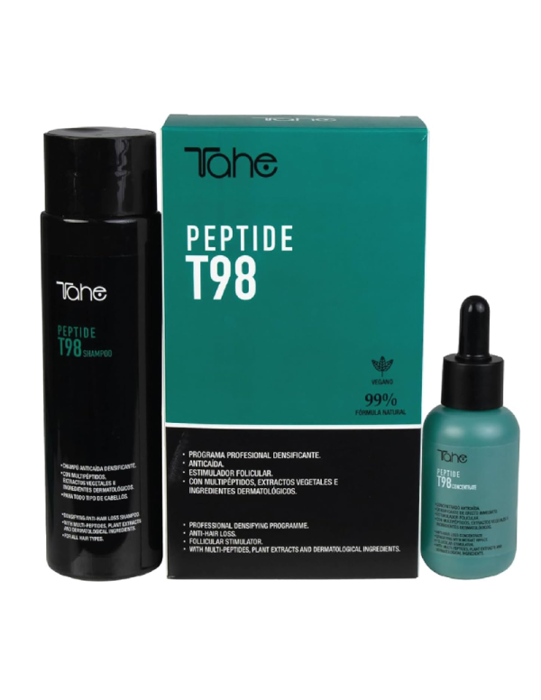 Pack que incluye los productos Concentrate Peptide T98, un tratamiento anticaída densificante, y Shampoo Peptide T98, champú anticaída densificante.