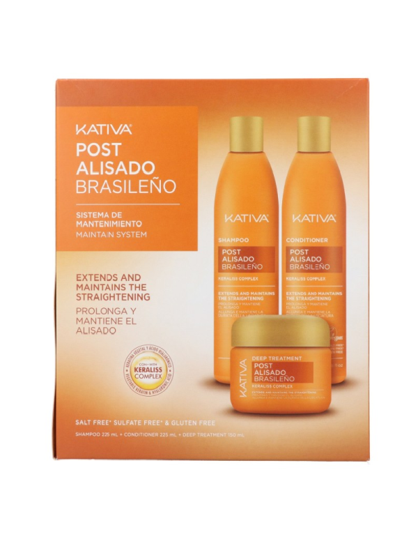 El kit post alisado de Kativa está recomendado para después de un tratamiento de alisado brasileño Kativa o para cabellos secos y maltratados.