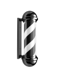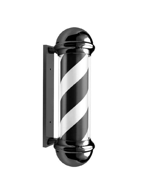 Poste barbero luminoso y rotativo con carcasa exterior negra.