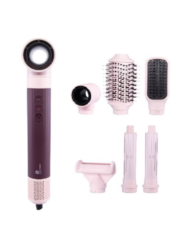 Es altamente versátil, incluyendo 6 cabezales intercambiables y permitiendo personalizar el secado con 3 niveles de velocidad y 3 temperaturas ajustables a cada tipo de cabello. Sus luces LED indican claramente los ajustes de velocidad y temperatura en uso.