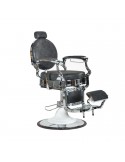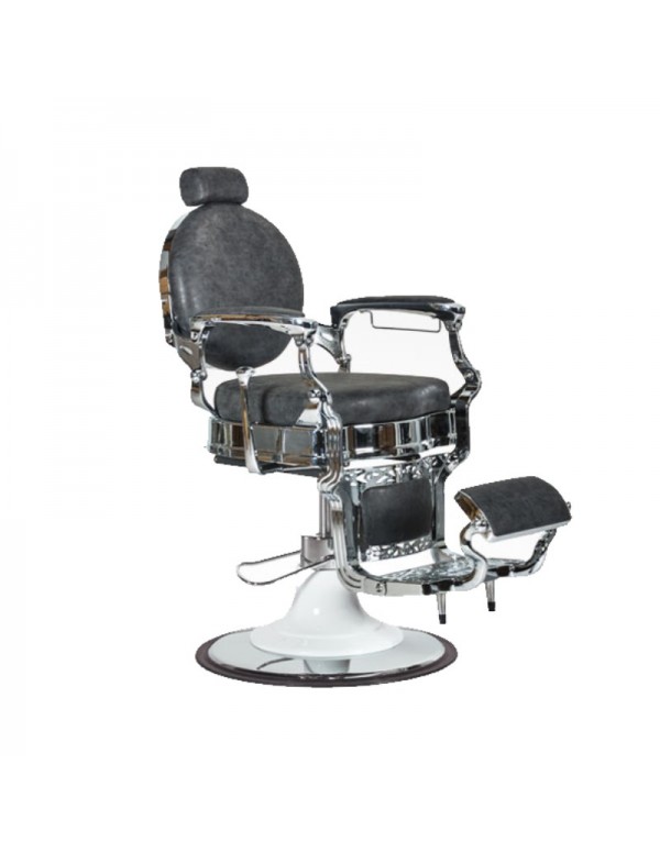 Sillón de barbero Sidhe Look clásico, con bomba hidráulica regulable en altura y base circular giratoria en metal cromado.