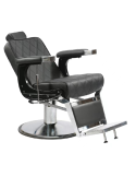 Sillón de barbero tapizado en serie negro con estructura negra elevación hidráulica con freno y giro 360˚, reposacabezas ajustable en altura, respaldo reclinable manual y reposapiés.
