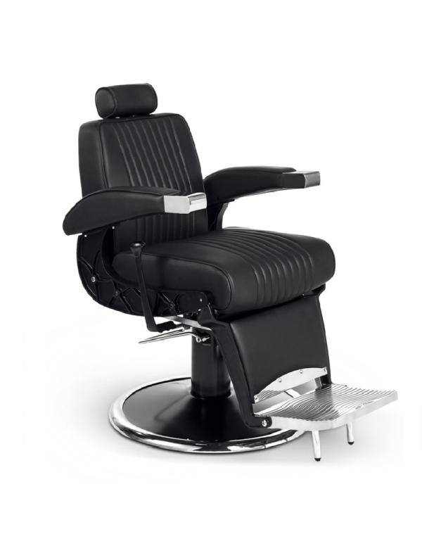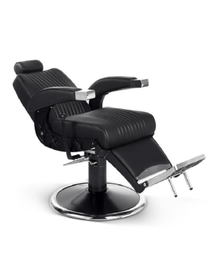 Sillón de barbero tapizado en serie negro con estructura negra elevación hidráulica con freno y giro 360˚, reposacabezas ajustable en altura, respaldo reclinable manual y reposapiés.