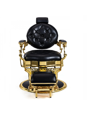 Sillón de barbero tapizado serie Negro NG3 con capitoné en el respaldo. Piezas cromadas en dorado. Diseño elegante y clásico.Ideal para cualquier barbería. Además, es retapizable para mayor personalización.