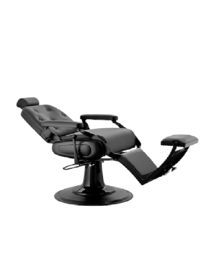 Sillón de barbero tapizado en serie negro con estructura negra elevación hidráulica con freno y giro 360˚, reposacabezas ajustable en altura, respaldo reclinable manual y reposapiés.